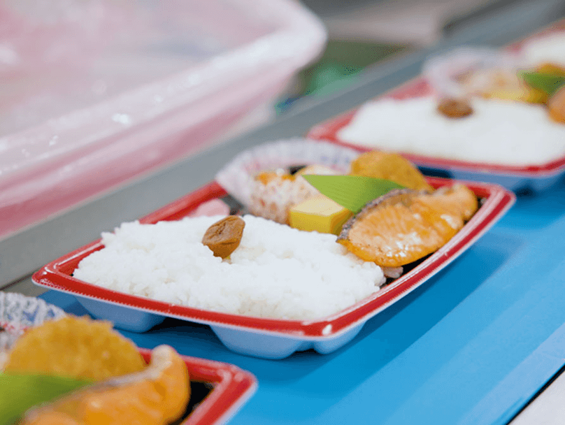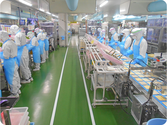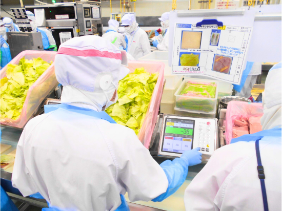 こうした仕組みづくりの一例として、盛付けラインでは減算式計量器を活用することで計量作業の負担を軽減し、落ち着いて規定重量を盛り付けることで、手直しの発生しない生産活動を実現しています。