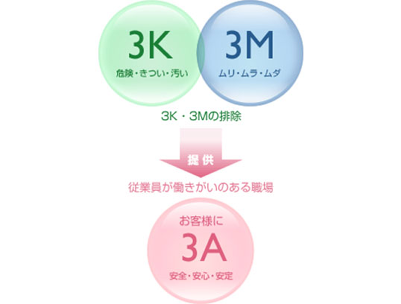 サンデリカでは近年の厳しい市場の変化に対応し、お客様のニーズに素早く的確にお応えするべく、5Sを機軸とした改革・改善に取り組んでおります。当社ではこの活動をサンデリカ生産方式(Sundelica Production Way)と名づけ、「3K(危険・きつい・汚い)」「3M(ムリ・ムラ・ムダ)」の排除によって、お客様に「3A(安全・安心・安定)」な商品の提供をお約束するとともに、従業員にとって働きがいのある職場づくりを目指しております。