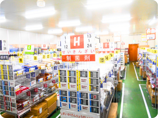 一例として、資材倉庫では、写真や文字、記号を用いて保管場所が一目で分かるようにしています。